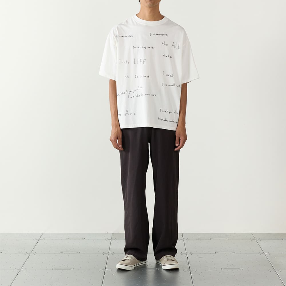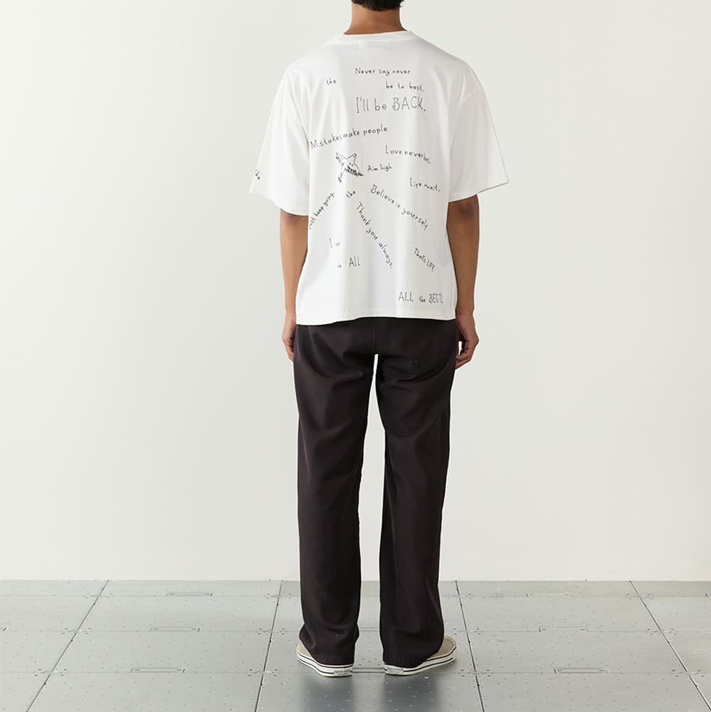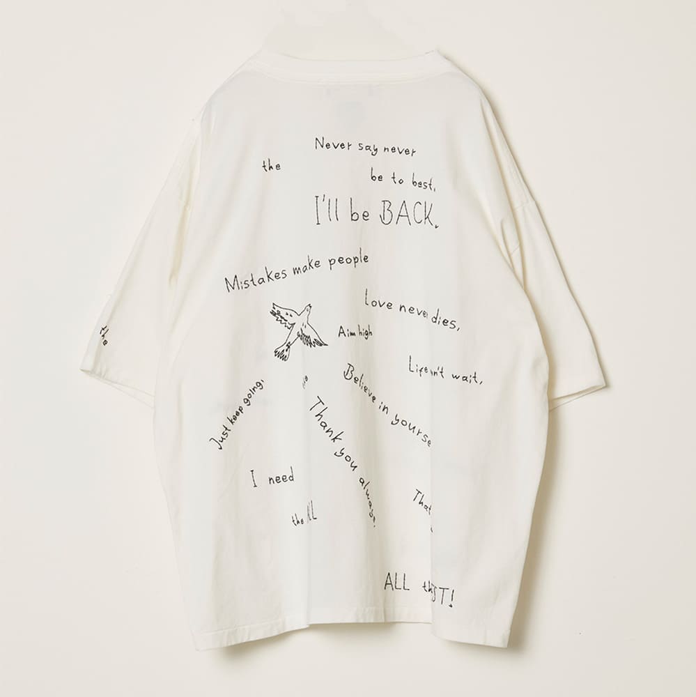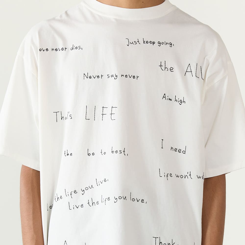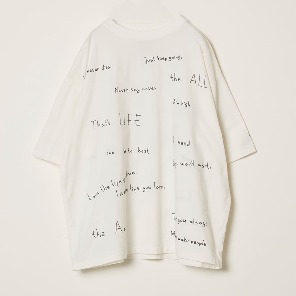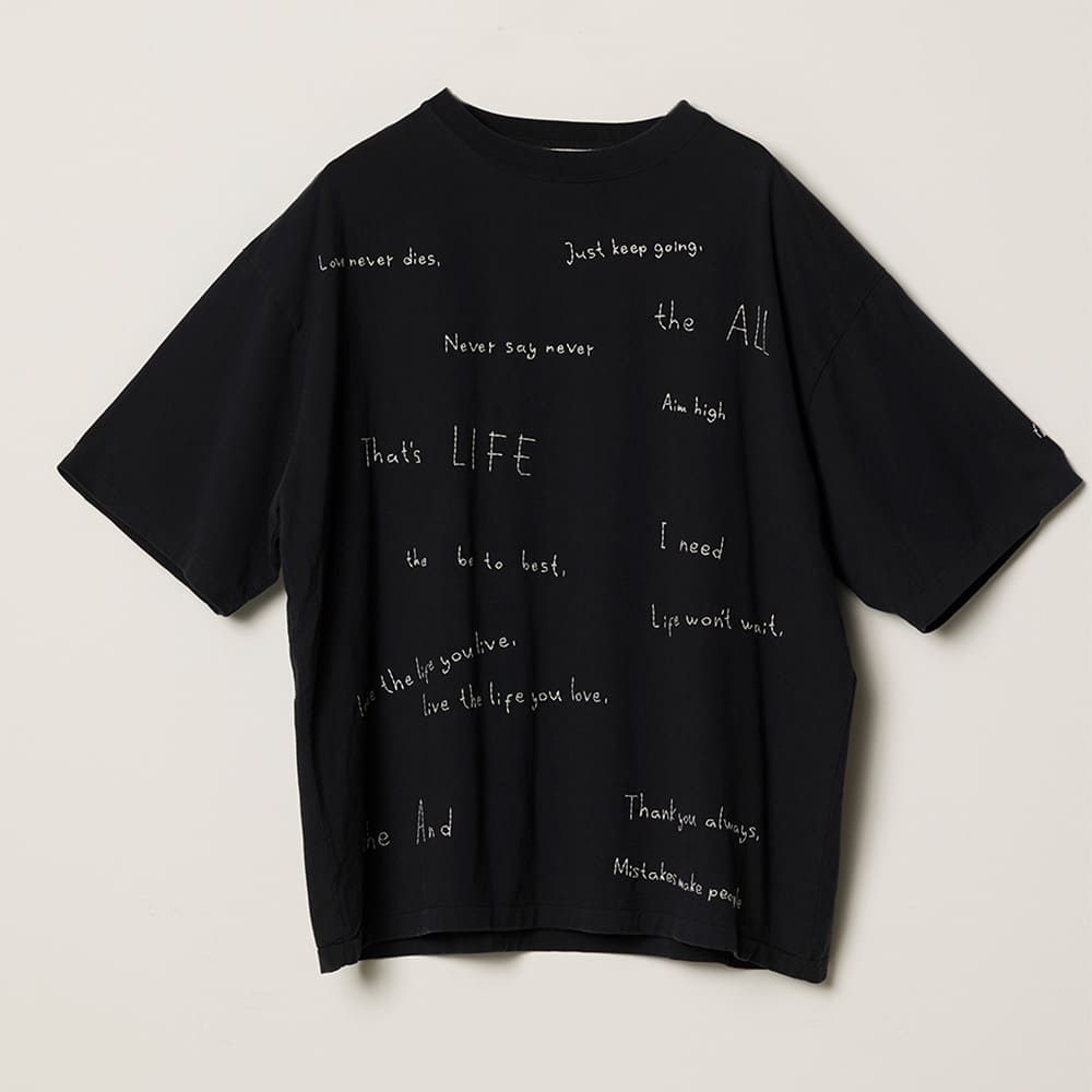 手書き風の文字をそのまま刺繍で表現した、遊び心のあるデザインTシャツ。