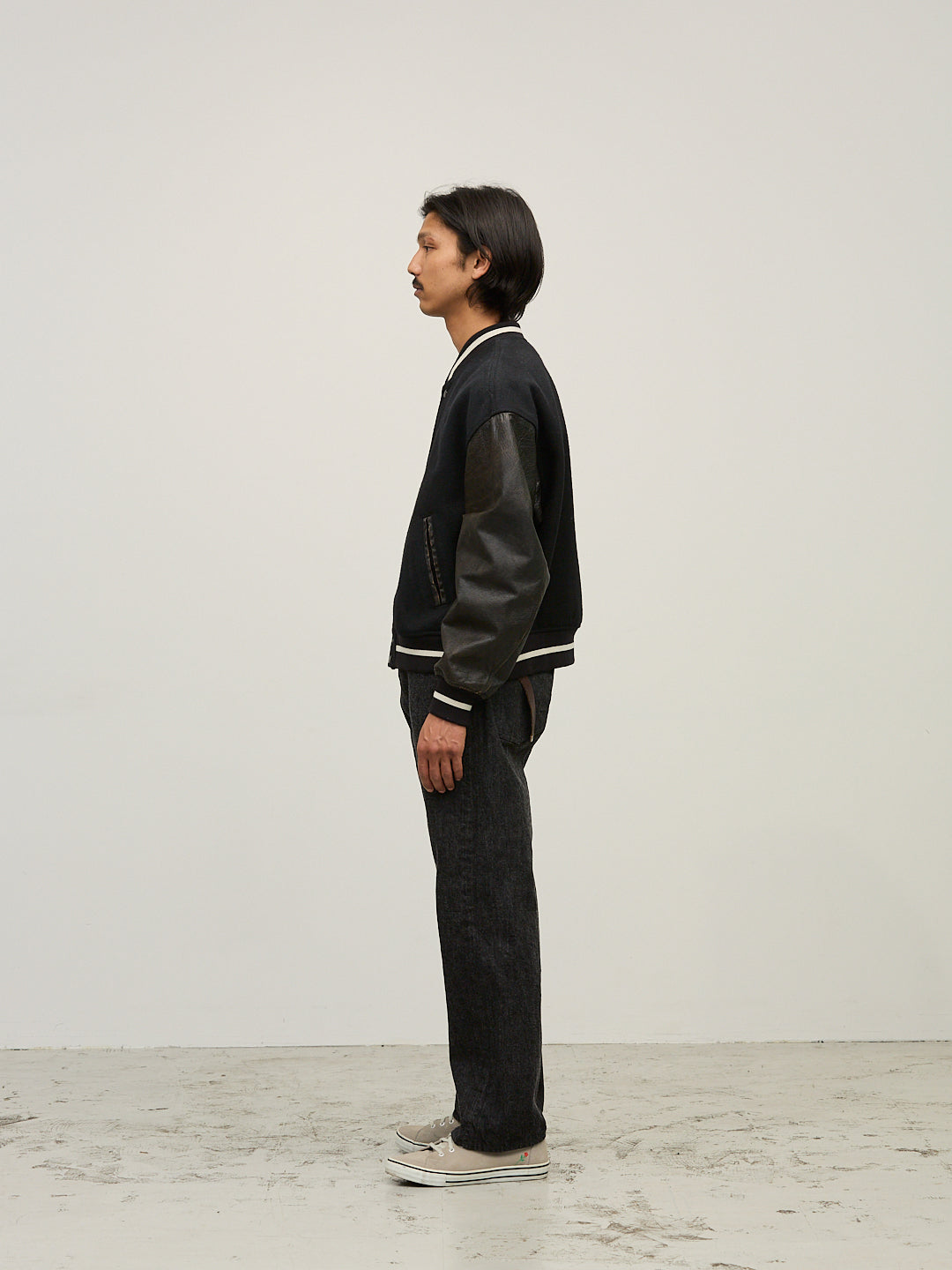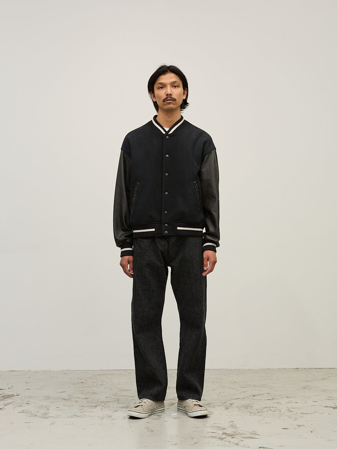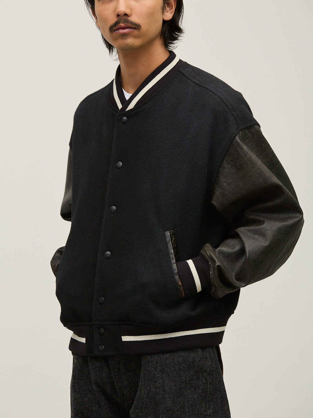고급 멜튼 소재를 사용한 클래식 스타디움 재킷.