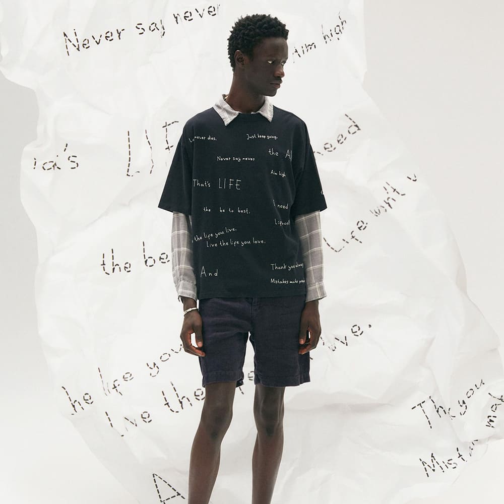 필기풍의 문자를 그대로 자수로 표현한, 장난기 있는 디자인 T셔츠.